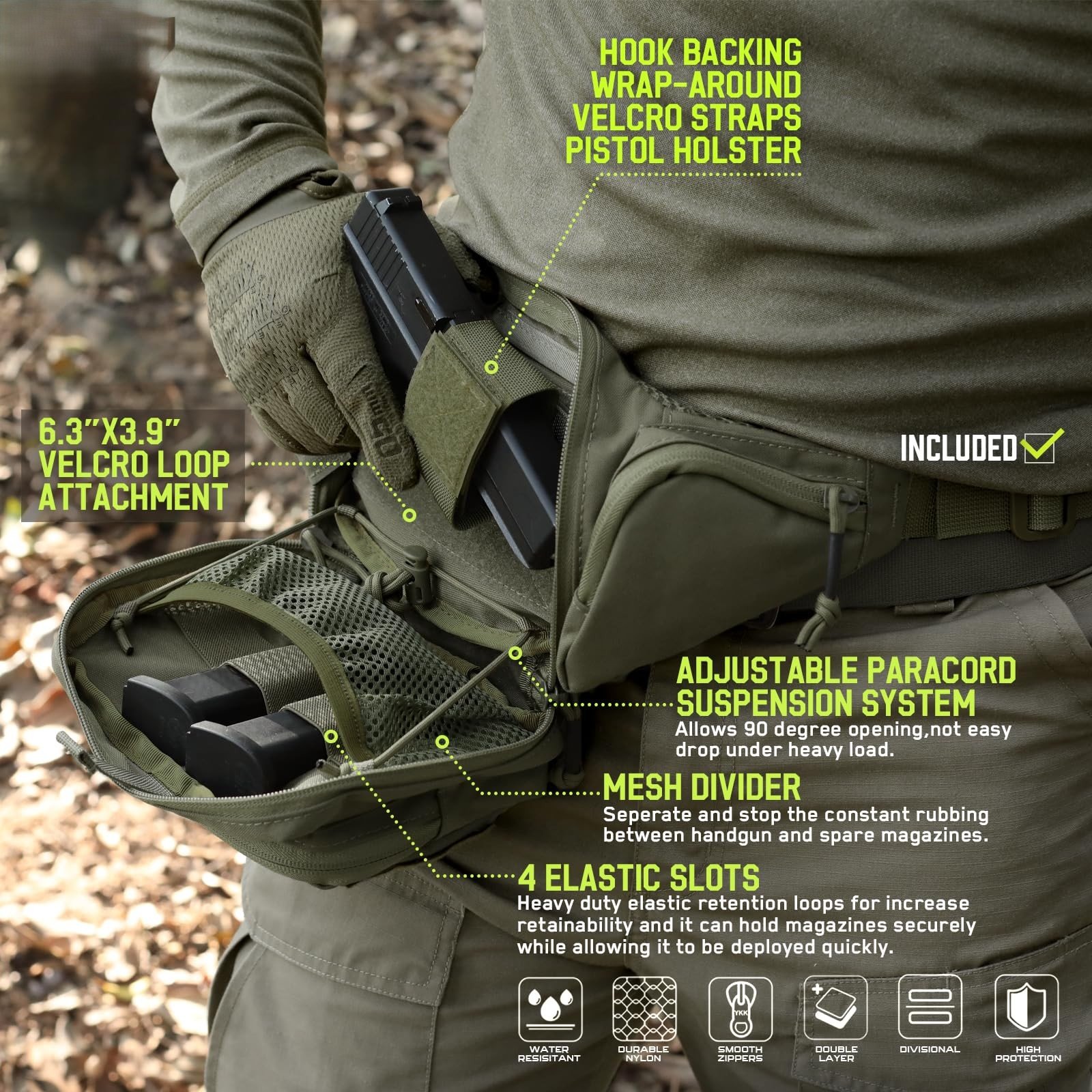 Keep your firearm secure and adaptable! The rear main compartment features a loop backing (6.5'L x 3.9'H / 16.5*10cm) that easily attaches to the included wrap-around Hook-N-Loop holster straps. Whether you’re left or right-handed, this pouch adjusts to your preferred carry style — locking your pistol firmly in place and ready for action!