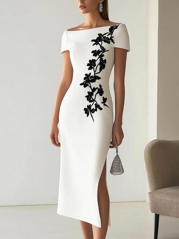 - Design: Features a sophisticated boat neckline and a striking asymmetrical floral print that draws the eye, giving the dress a modern yet artistic flair