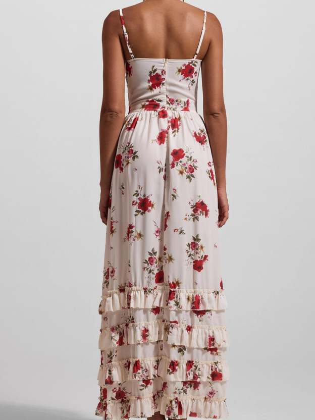 Blue and White Floral Halter Neck Backless Layered Ruffle Maxi Dress