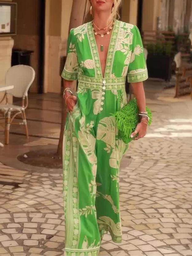 This jumpsuit is designed to be effortlessly flattering and comfortable. Featuring a bright floral print, a flattering V-neck and flowing short sleeves, this jumpsuit is perfect for a beach vacation, a casual outing or a summer party.