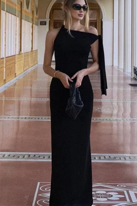 One-shoulder, Draped Neckline, Tie Detail, Maxi Length.