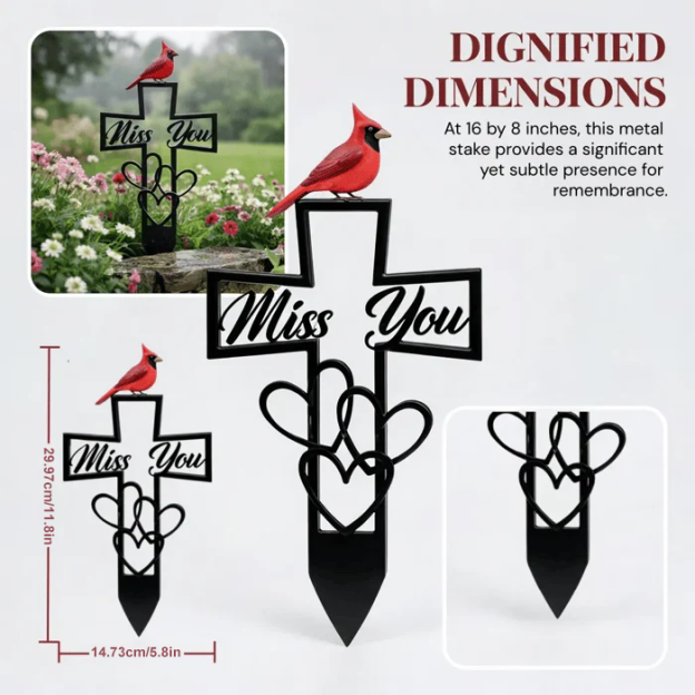 A beautiful and meaningful memorial stake designed to honor someone you deeply miss. Featuring a classic cross shape, “Miss You” script, heart accents, and a bright cardinal topper, this metal grave marker adds a touching, comforting presence to any cemetery plot, memorial garden, or remembrance space.