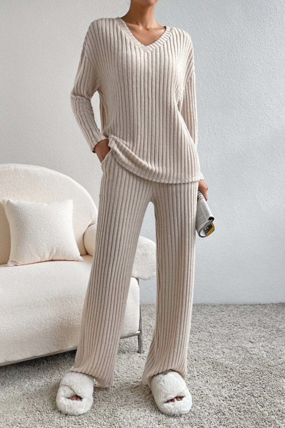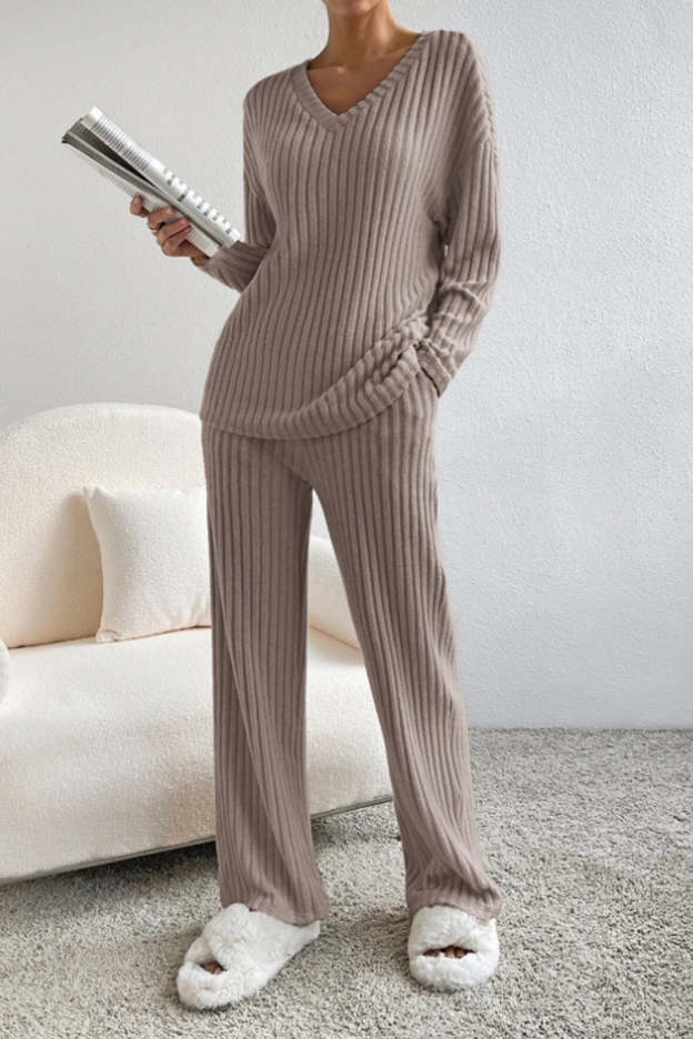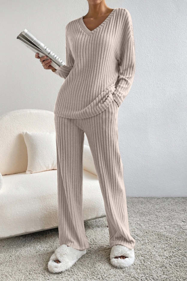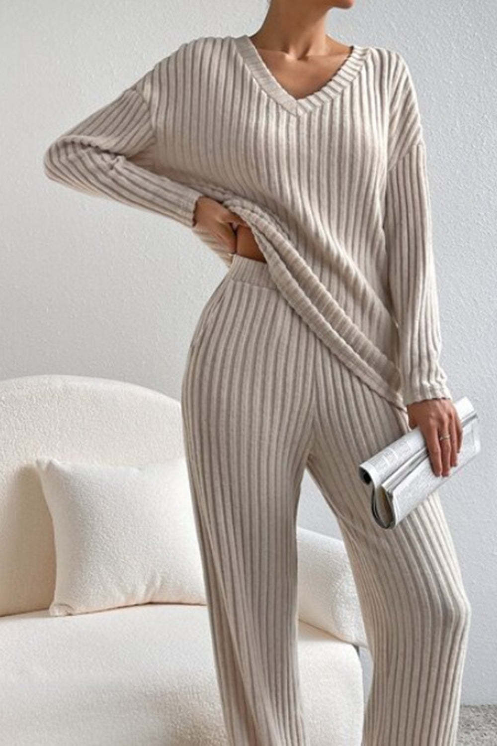 Elevate your loungewear with our Ribbed V-Neck Top and Pants Set. Made with high-quality ribbed fabric, this set offers both comfort and style. The v-neck top adds a touch of sophistication, while the ribbed texture adds depth and luxury. Perfect for relaxing at home or running errands in style.