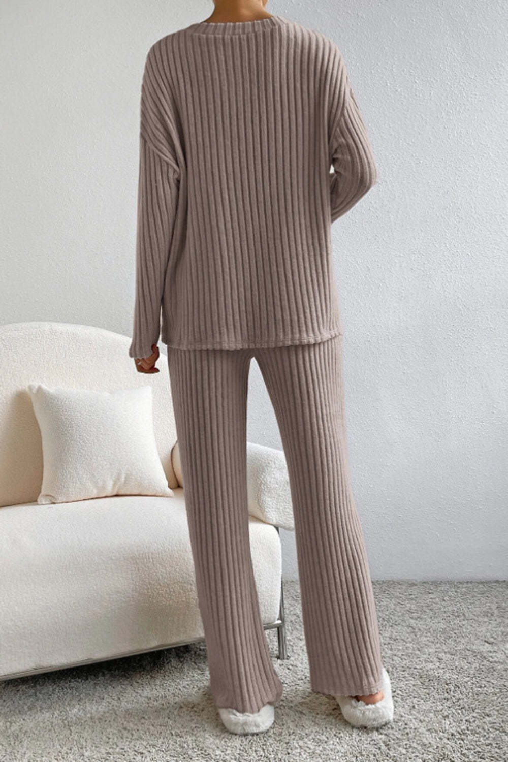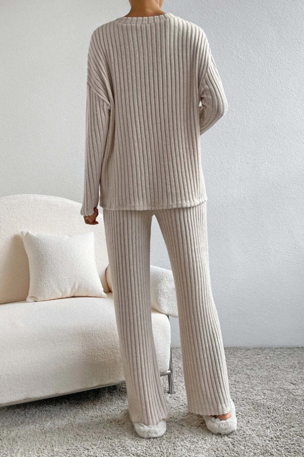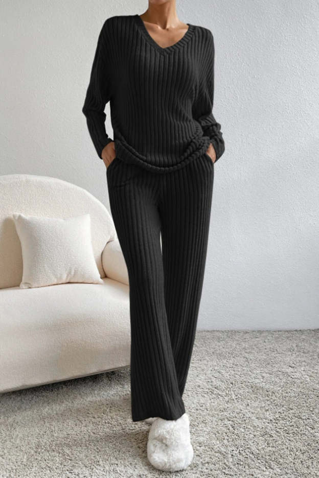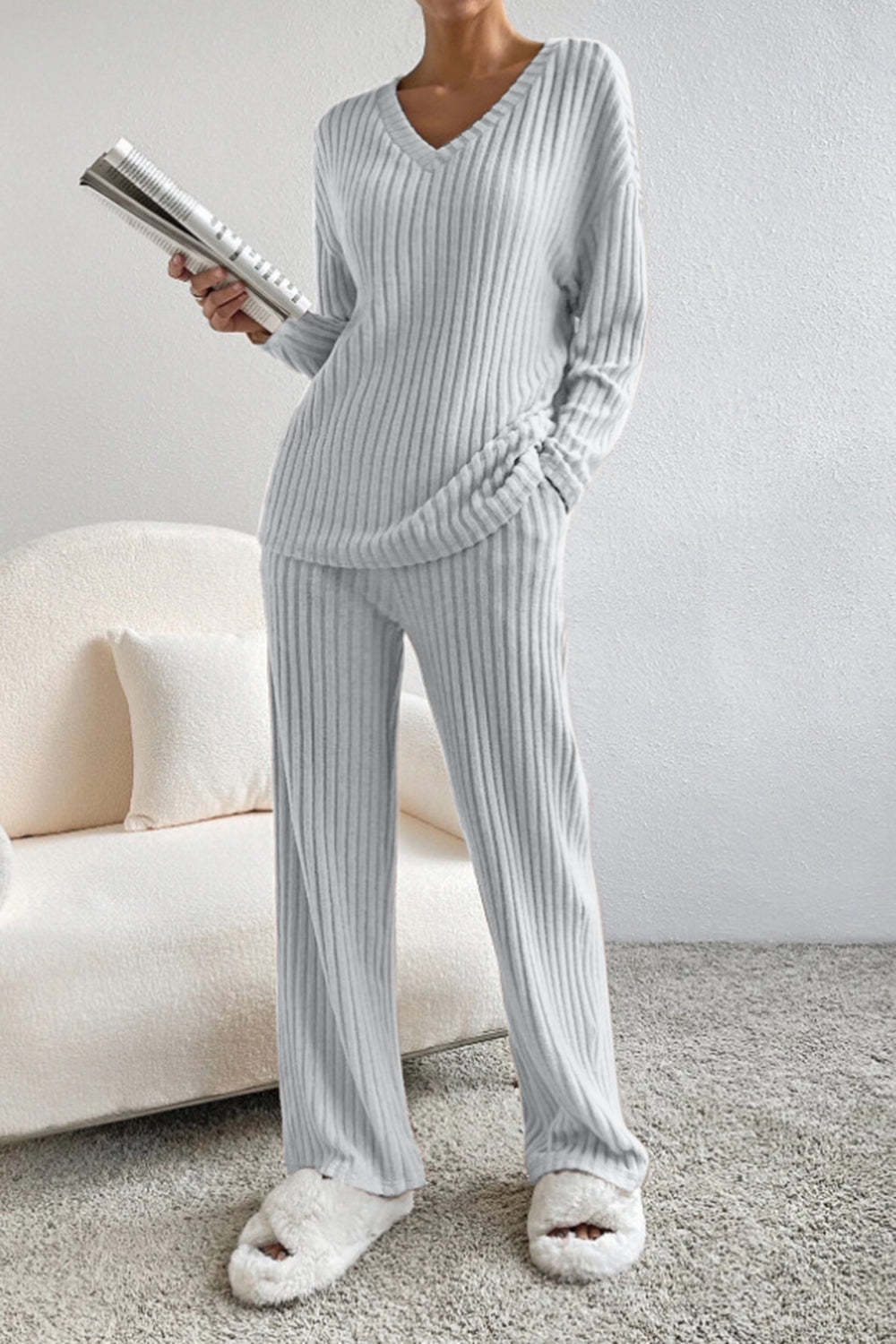 Elevate your loungewear with our Ribbed V-Neck Top and Pants Set. Made with high-quality ribbed fabric, this set offers both comfort and style. The v-neck top adds a touch of sophistication, while the ribbed texture adds depth and luxury. Perfect for relaxing at home or running errands in style.