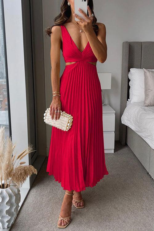 V Neck Cut Out Waist Sleeveless Pleated Maxi Dress